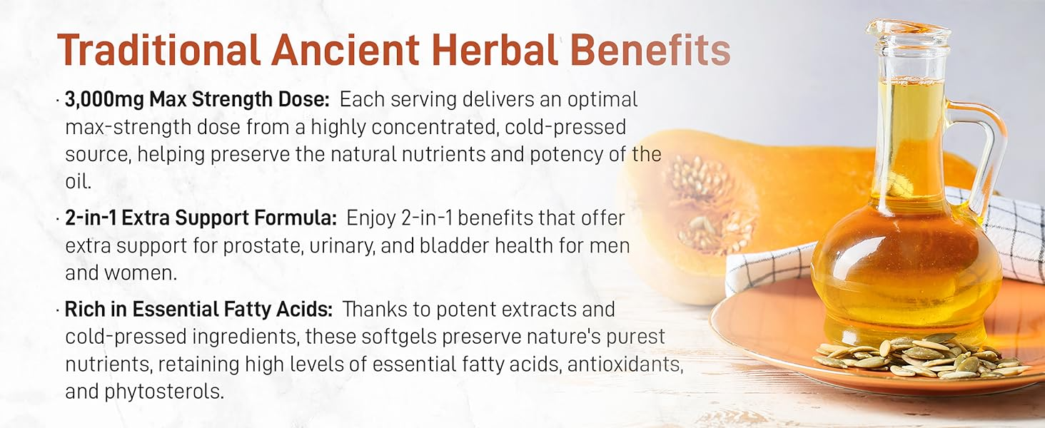 Pumpkin seed oil naturally contains essential fatty acids and phytosterols that help support prostate function, urinary health, and general wellness as part of a balanced lifestyle.*